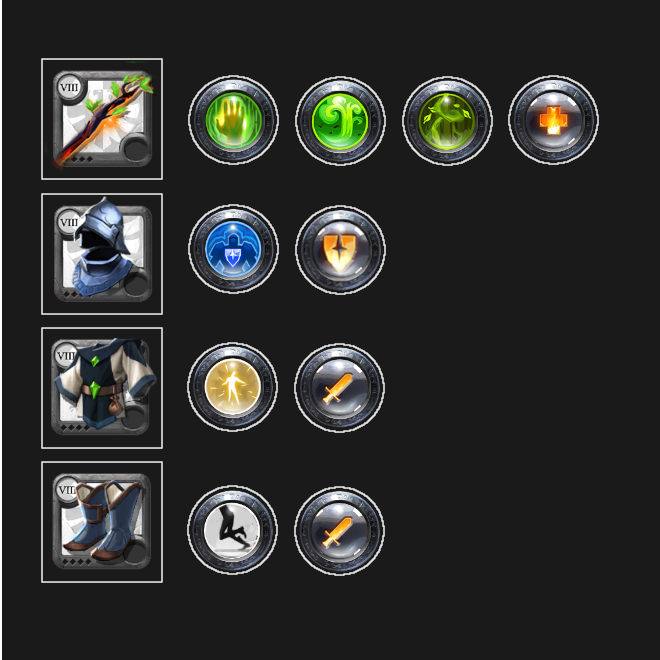 Vous pouvez remplacer votre bâton de fléau par un bâton effréné ou un bâton sauvage avec les mêmes sorts (les 3 bâton se joue de façon très semblables, avec juste les zones de soin du 3ème sort qui diffèrent). Vous pouvez également remplacer le casque de chevalier par n'importe quel capuche de cuir avec "purification" (qui permet l'enlever les effet de CC à tout les alliés dans un rayon de 4m).